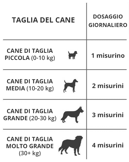 - Per cani di peso compreso tra 10 e 20 kg, 2 misurini al giorno mescolati al cibo per cani.